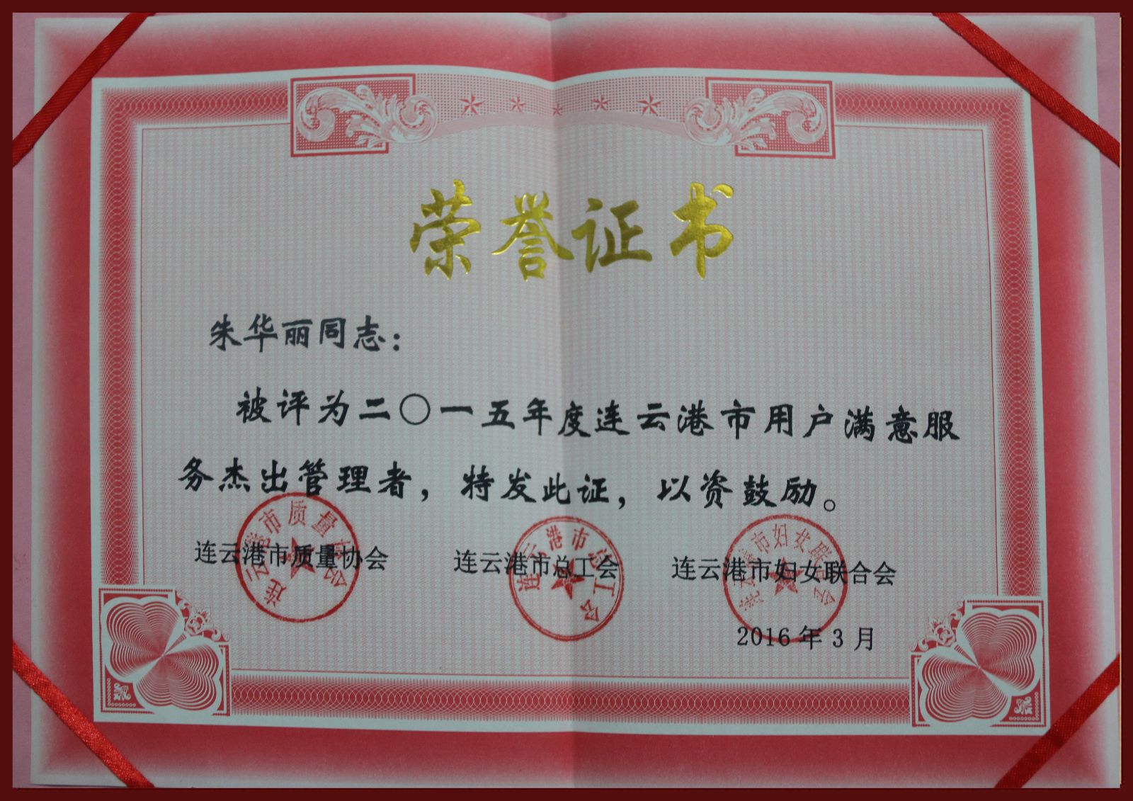 來源:新浦公司 作者:胡秀琴 根據“關于組織開展2015年度連云港市用戶滿意服務之星活動的通知”(連質協[2015]25號)要求,經過材料審核,現場調查和專家評審,公交新浦公司朱華麗同志榮獲“2015年連云港市用戶滿意服務杰出管理者”稱號。