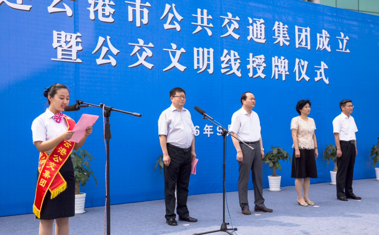 9月12日上午10時,連云港市公共交通集團成立暨四條文明線授牌儀式在公交集團院內成功舉行,標志著我市公交事業發展進入了新起點,踏上了新征程。副市長尹哲強出席活動并為市公共交通集團揭牌,市財政局局長孫宗鳳、市發改委、經信委、國資委、公安局、交通局、國土局、規劃局、城鄉建設局、運管處、交警支隊、公安公交分局等市相關部門負責人以及市交通控股集團領導、部門及權屬單位負責人、市公共交通集團員工代表參加活動。市交通控股集團黨委書記、董事長劉永能主持活動儀式。