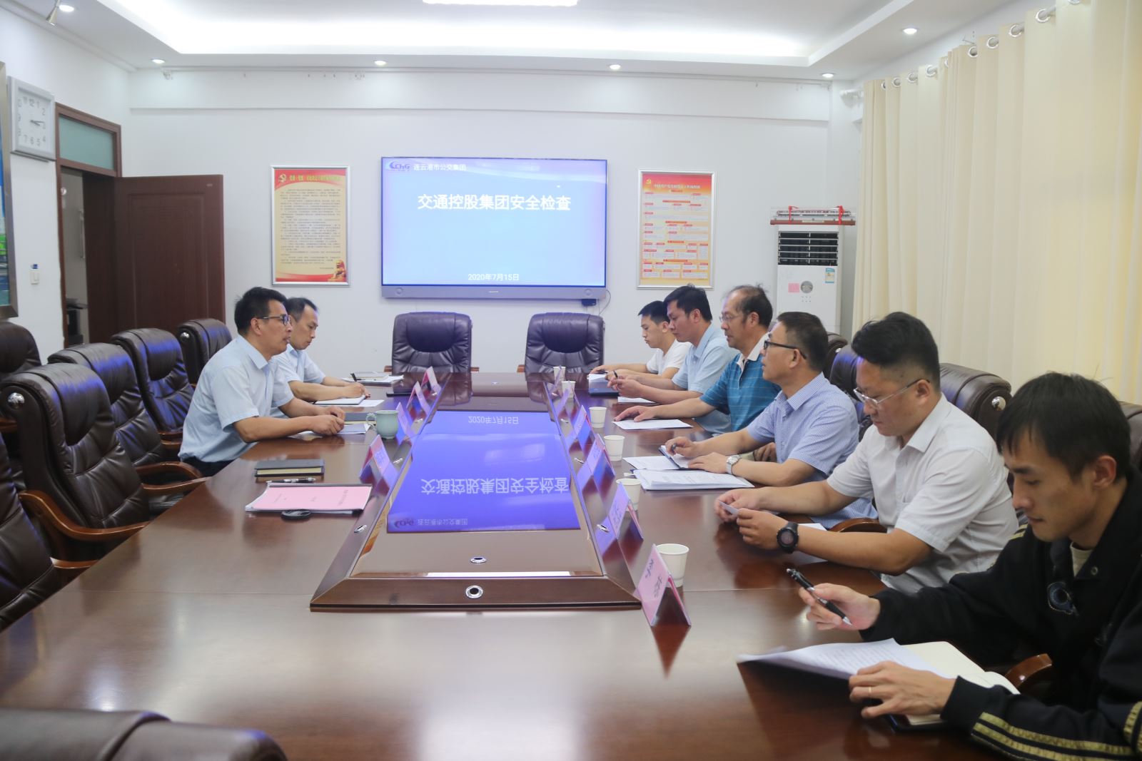 2020年7月16日下午,交控集團副總經理孫超帶領安監部部長茅紅兵一行七人到公交集團督查貴州安順公交車墜湖事件發生后,公交集團安全生產自查自糾工作開展情況及防控措施落實情況,公交集團黨委書記、總經理周文君、分管安全副總經理王學兵、安全保衛部部長于亮陪同檢查。